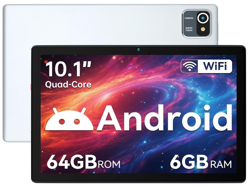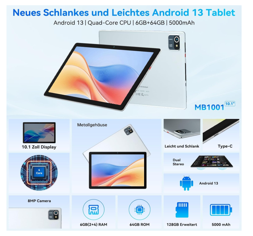 10 Pouces Tablette Android 13 Tablettes 6 Go RAM + 64 Go ROM Quad-Core 5000 mAh 1280 x 800 Écran Tactile HD 5MP + 8MP Caméra HD Bluetooth 5.2 Tablette PC (Argent)